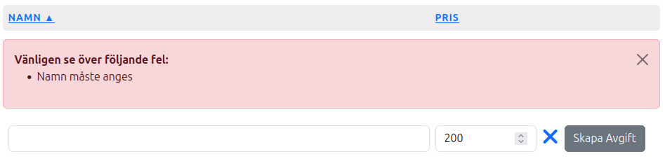 - Kombinationen av namn och pris måste vara unik. Det får alltså inte finnas flera avgifter som har samma namn och pris.