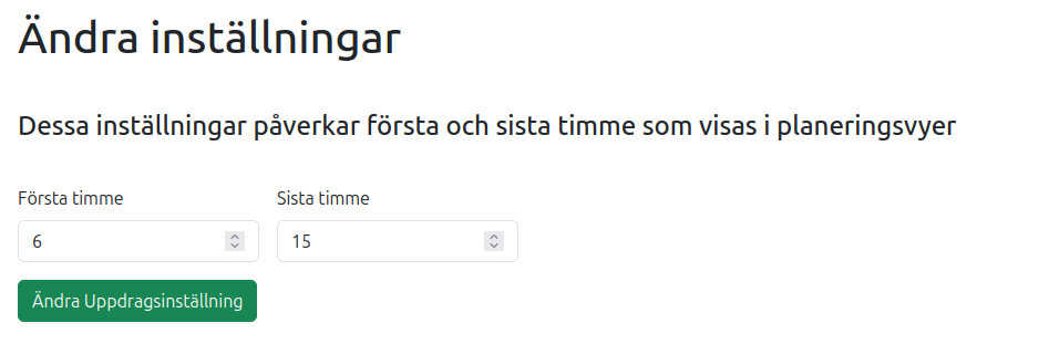 Sidan visar ett formulär med aktuella inställningar förifyllda. Här kan du ändra första och sista timme som visas i planeringsvyer. Det gör att du kan styra så att planeringsvyerna visar tider som matchar hur du och ditt företag jobbar.