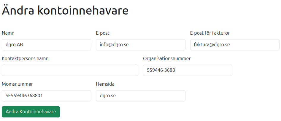 I det här avsnittet hanterar du uppgifter som gäller kontoinnehavaren, det vill säga information om ditt företag kopplat till kontot i systemet.