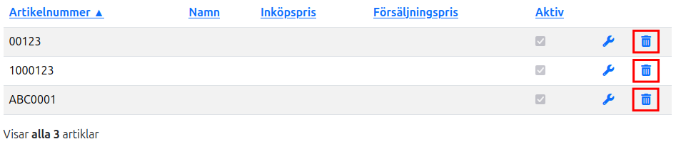 I tabellen finns en papperskorgsikon på varje rad. Klicka på denna för att ta bort artikeln. För att förhindra oavsiktlig borttagning behöver du bekräfta åtgärden innan artikeln tas bort.