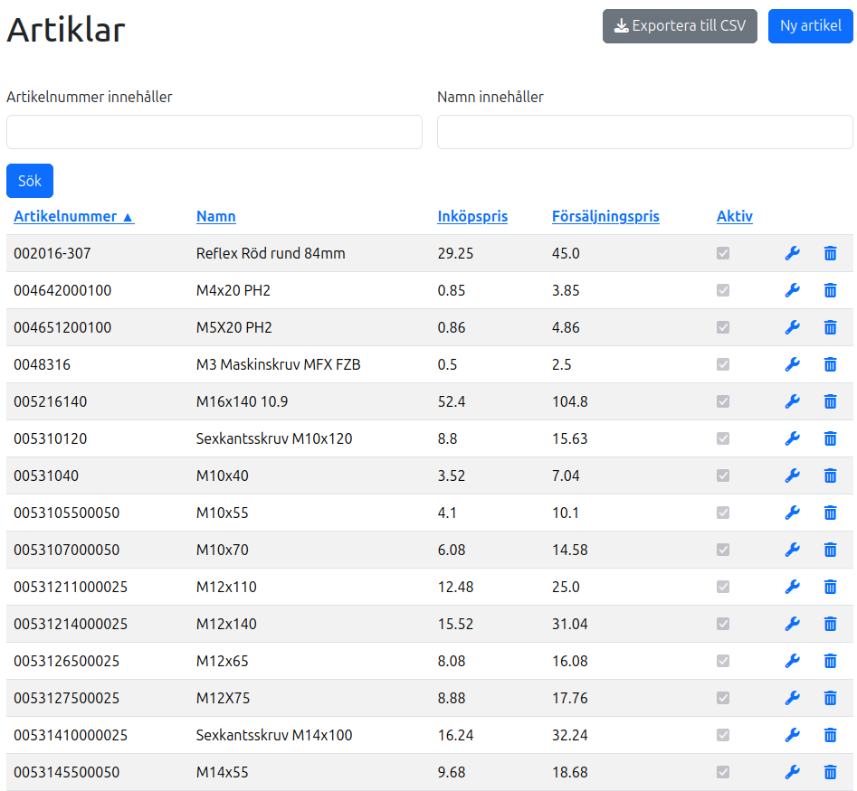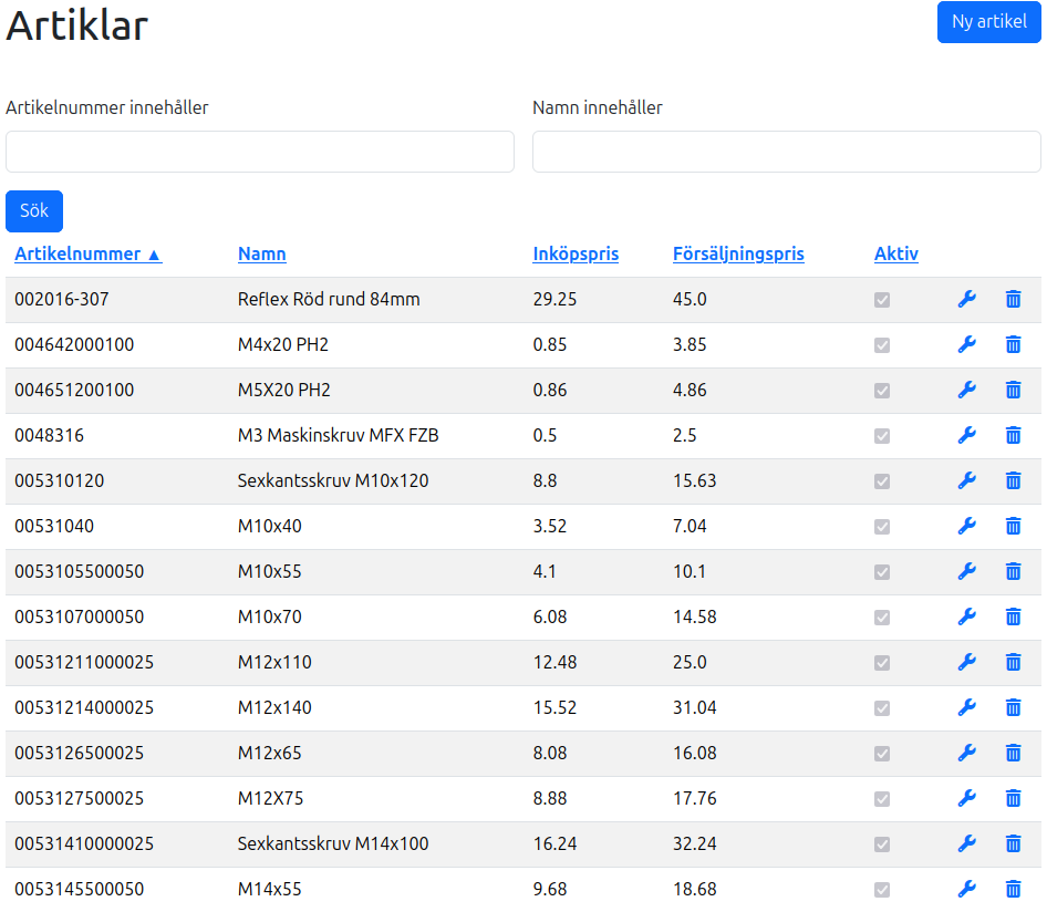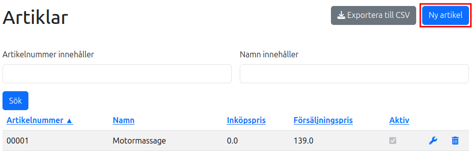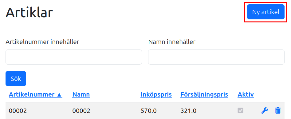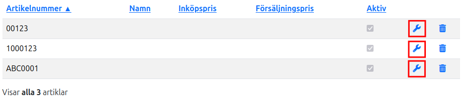 För att ändra en befintlig artikel klickar du på skiftnyckelsikonen i tabellen.