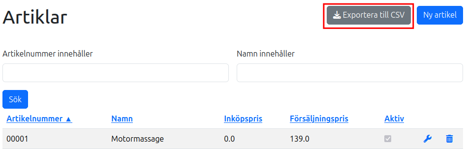 Artiklar kan exporteras till en CSV-fil genom att klicka på knappen Exportera till CSV på artikelsidan.