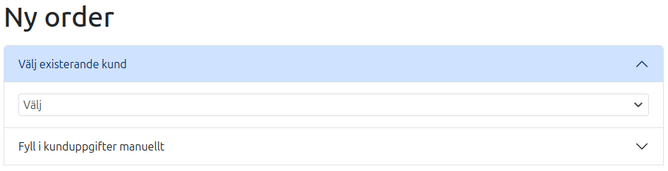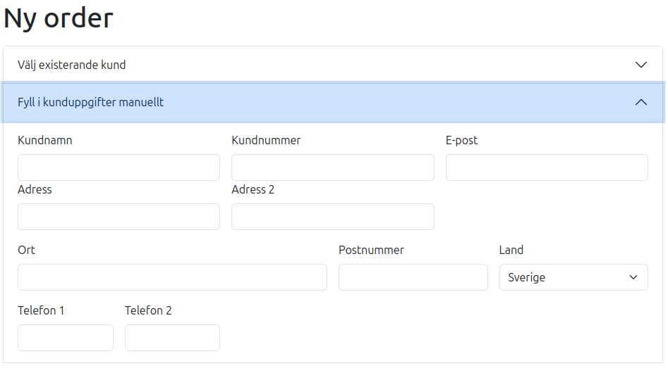 Då öppnas ett formulär där du anger orderns uppgifter. Först anges kunduppgifter, vilket kan göras via något av följande alternativ: