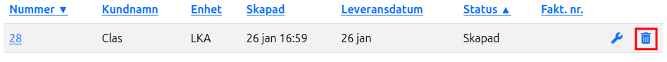 I tabellen finns en papperskorgsikon på varje rad. Klicka på denna för att ta bort order. För att förhindra oavsiktlig borttagning behöver du bekräfta åtgärden innan kunden tas bort.