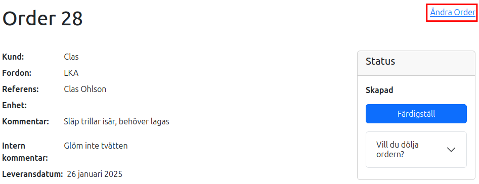- Klicka på länken med texten Ändra Order när du visar en specifik order