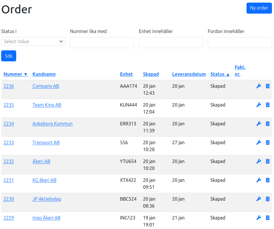 Orderlistan visar alla ordrar i systemet och är den plats där du hanterar, följer upp och arbetar med dina ordrar i vardagen. Här får du snabbt en överblick över varje order och kan enkelt öppna en order för att se mer detaljer.