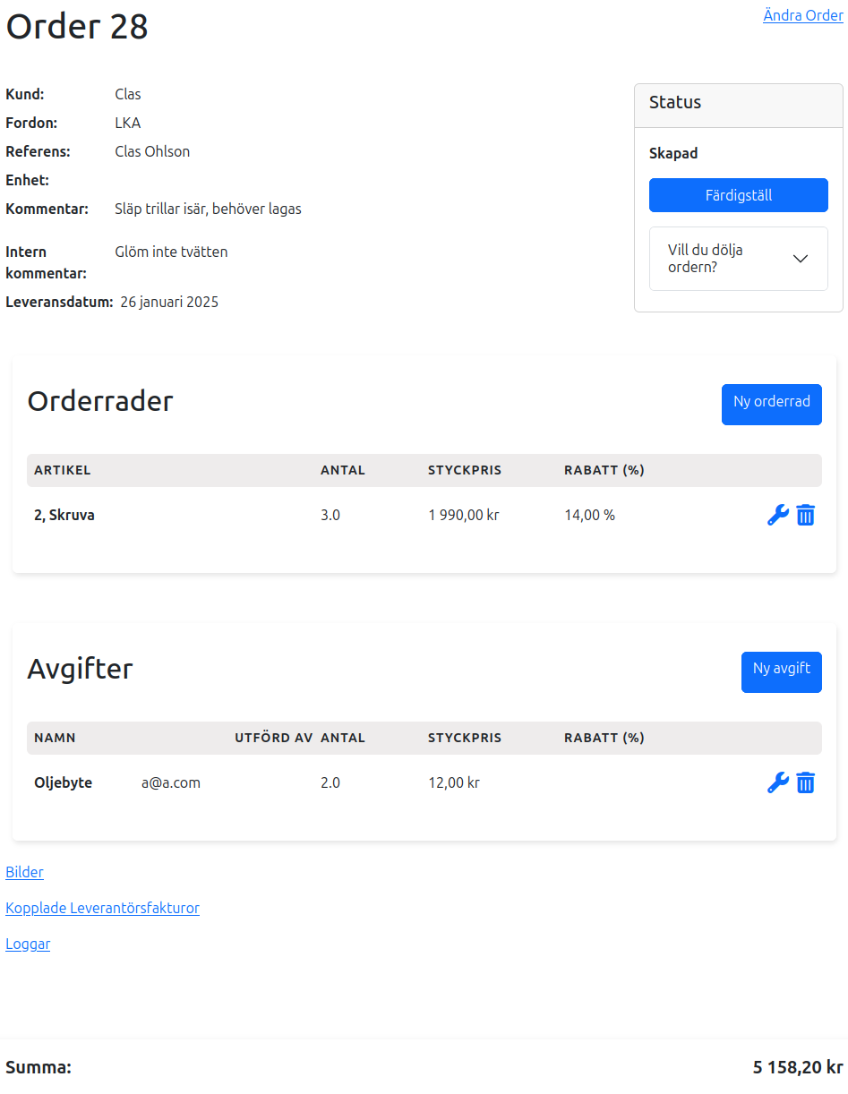 Denna sida visar information om en specifik order. Här kan du även hantera: