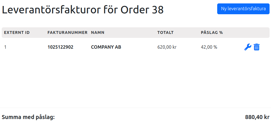 För att ändra en befintlig kopplad leverantörsfaktura klickar du på skiftnyckelsikonen i tabellen.