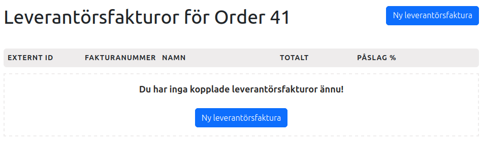 Om inga kopplade leverantörsfakturor ännu har skapats visas ett meddelande om detta, tillsammans med en knapp för att skapa en ny kopplad leverantörsfaktura.