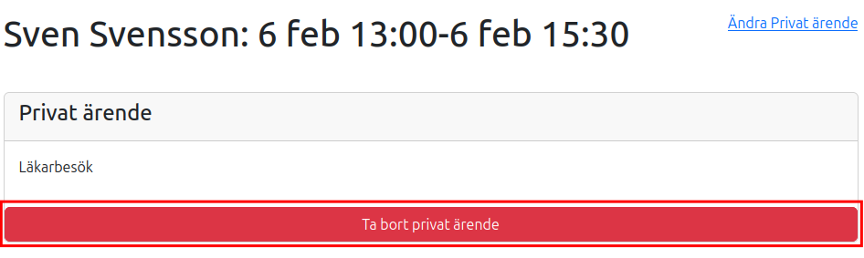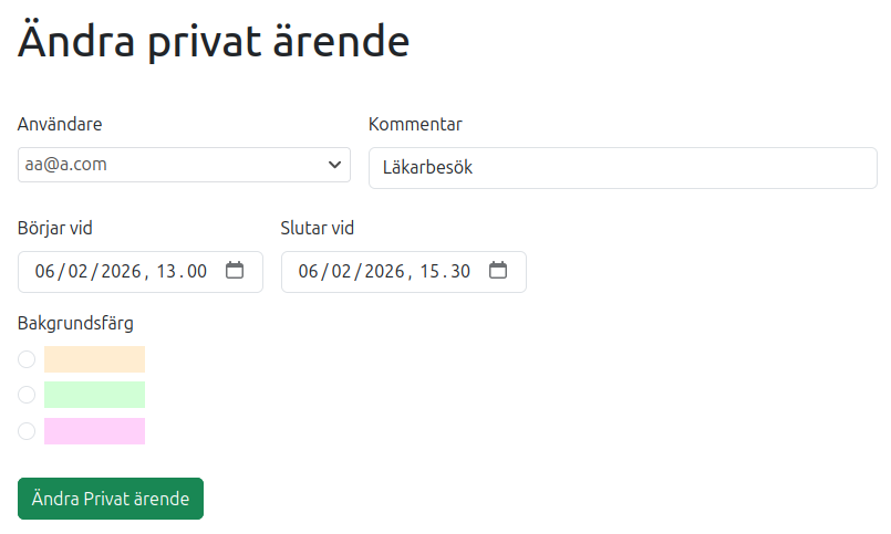Samma formulär som används vid skapande av ärende visas, men med befintliga värden ifyllda. Klicka på Ändra Privat ärende för att spara ändringarna.
