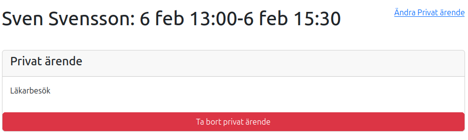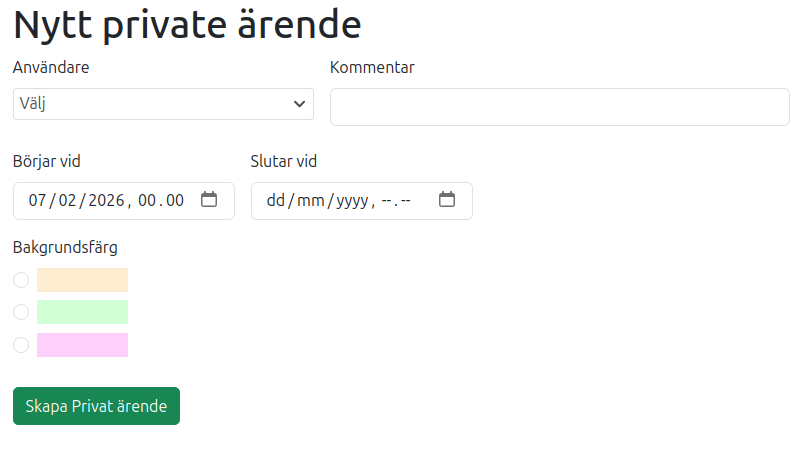 Privata ärenden används för att markera att en användare inte är tillgänglig under en viss tid, till exempel vid läkarbesök, semester eller annan frånvaro. Avsnittet beskriver hur du skapar, redigerar och tar bort privata ärenden.